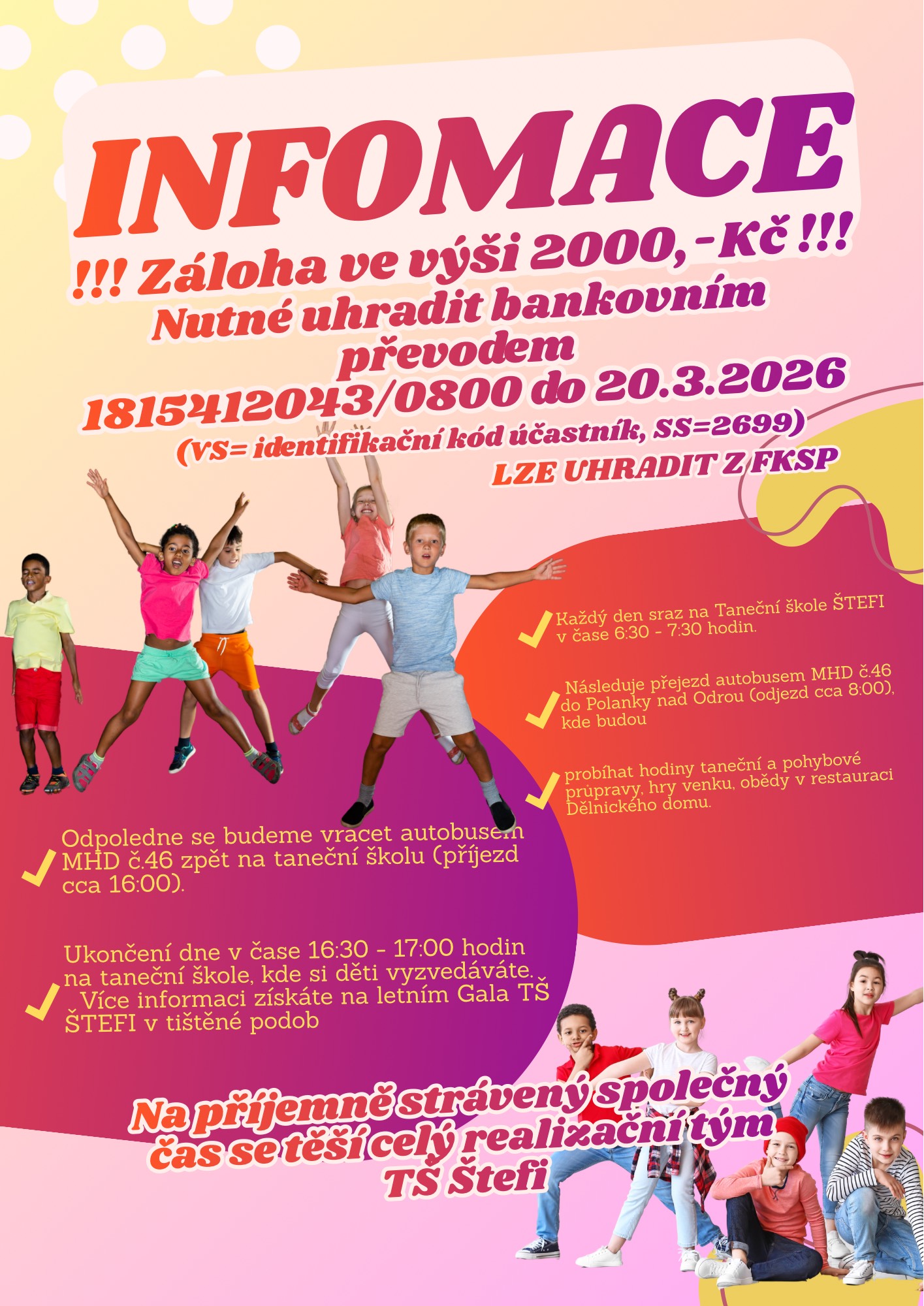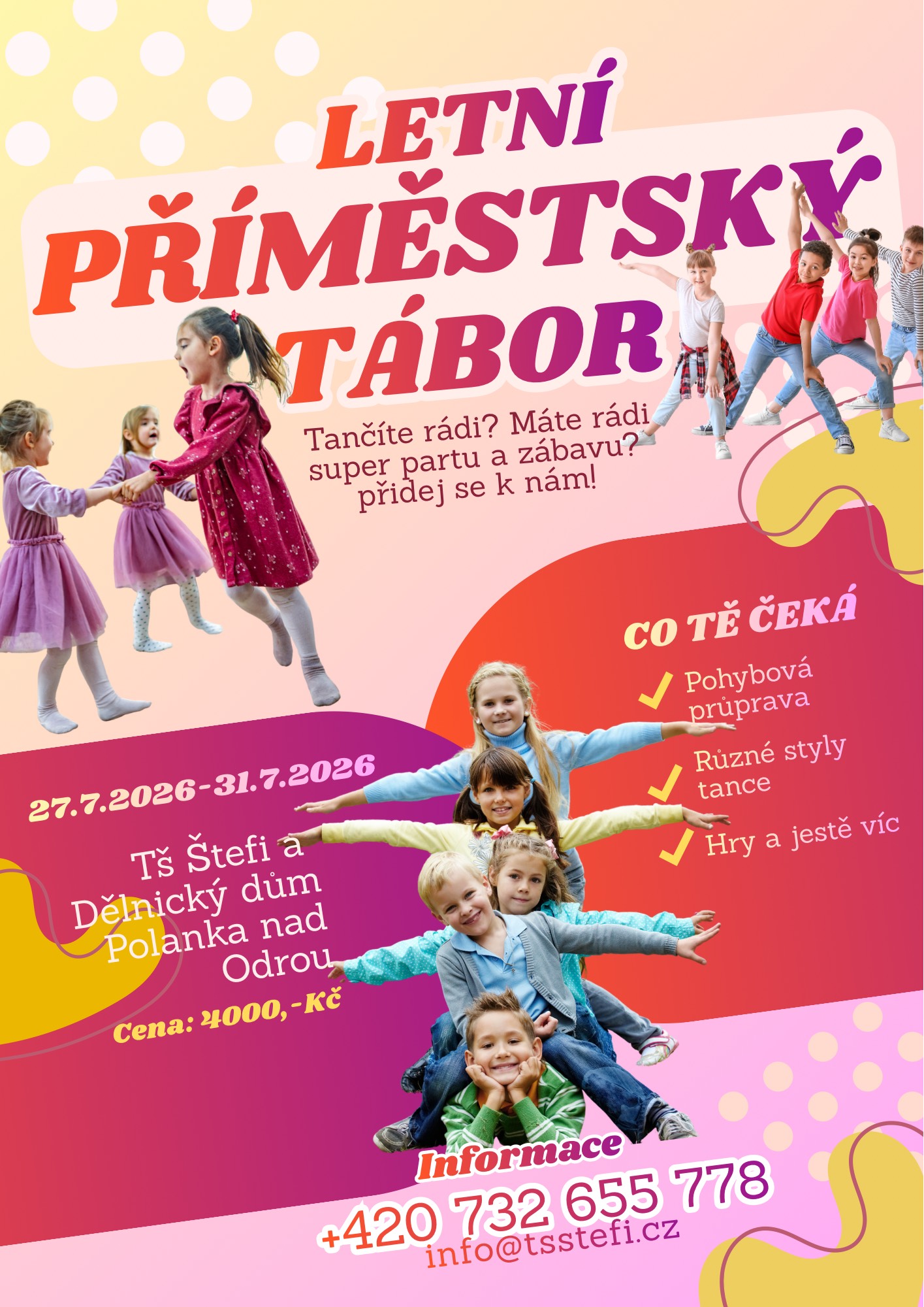 Ve škole vyučujeme v pravidelných hodinách základní taneční a pohybovou výchovu dětí ve věku 3-6 let, 6-8 let a 8-15 let. Seznamujeme děti s různými tanečními styly - show dance, disco dance, modern dance, street dance, hip hop, ale i základy latinsko-amerických a standardních tanců…